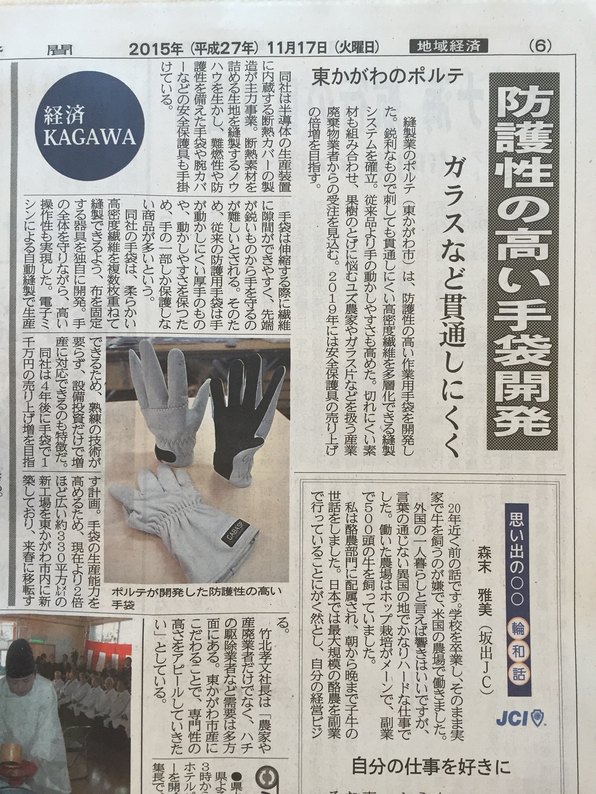 NEWS 2015.11.17 四国新聞に掲載されました。(2015年11月17日号) 2015年11月17日に四国新聞の経済紙面に弊社の突き刺し防止手袋の記事が掲載されました。 Tweet << Previous / Next >>
